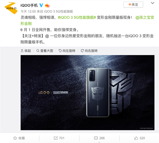 探索之心、敢越星辰,iQOO 3變形金剛限量版將于6月1日全網(wǎng)開售,作為iQOO粉絲的各位酷客們,可以準備出手搶購了。