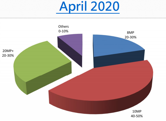 在像素鏡頭出貨量方面,5月1K-2K萬像素鏡頭整體占比80%,相比一季度1K-2K萬像素鏡頭總出貨量70%有所上升,筆者認(rèn)為,這與智能手機攝像頭朝高像素發(fā)展有關(guān)。