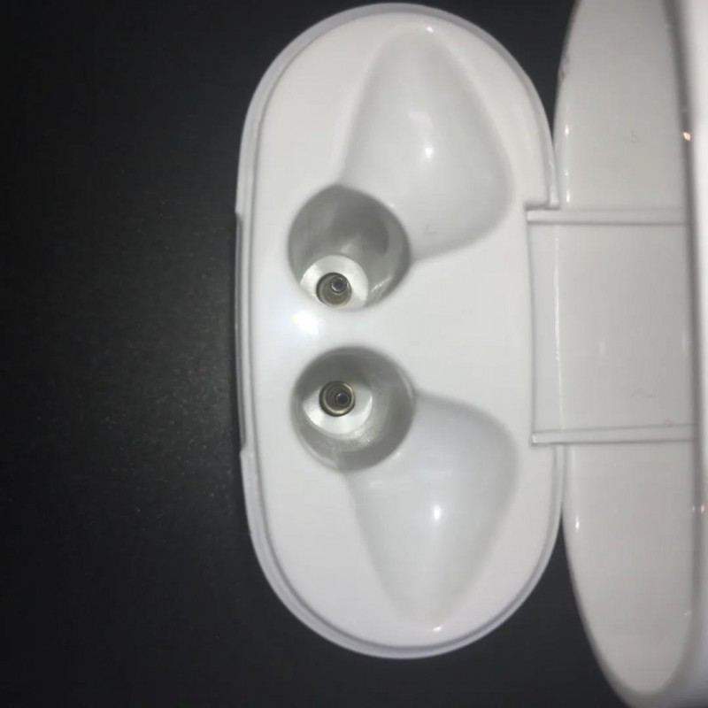 兩個耳機比Air pods大了一圈,尤其是耳機柄設(shè)置的小小呼吸燈,非常復(fù)古。夸張的是耳機內(nèi)的呼吸燈可以透過外殼閃爍,甚至于透過充電倉也能看到閃爍的“跑馬燈”。充電倉內(nèi)部采用了類似Air pods的設(shè)計,更驚奇的發(fā)現(xiàn)在充電槽內(nèi)。不像多數(shù)TWS耳機內(nèi)有磁吸觸極或頂針充電,i7S內(nèi)充電槽竟然是類似3.5mm三段式的OMTP,看似有1cm長的接口,耳機充電時接入接口。十分簡陋。