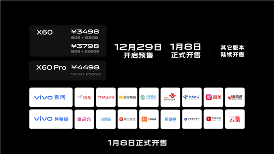 價格方面,vivo X60提供8GB+128GB、8GB+256GB、12GB+256GB三個配置版本可供選擇,價格分別為3498元、3798元和3998元;vivo X60 Pro提供12GB+256GB配置,價格為4498元。12月29日,vivo X60系列正式開啟預售,1月8日正式開售。