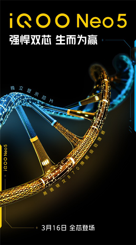 2021年3月4日, iQOO手機官方微博公布iQOO Neo5新品將于3月16日19:30正式亮相。iQOO Neo5定位“雙芯旗艦”,擁有驍龍870領(lǐng)銜的“性能超體”,將給予用戶旗艦級強悍性能體驗;獨立顯示芯片是新機的另一大亮點,它將為手機帶來優(yōu)秀的游戲視覺,以及穩(wěn)定、流暢且功耗更低的高幀游戲體驗。