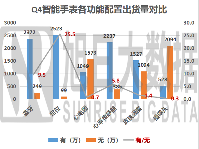 根據(jù)數(shù)據(jù)君的統(tǒng)計(jì)分析可以看出,消費(fèi)者對(duì)藍(lán)牙、定位、心率監(jiān)測(cè)的需求極為突出,按照出貨量的功能有無比來看數(shù)量差距巨大。對(duì)有無溫度測(cè)量的需求數(shù)量相當(dāng),而對(duì)心電圖測(cè)量和擁有攝像頭的需求則相對(duì)消極。
