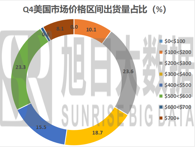 美國(guó)的消費(fèi)能力最高,200-500美元的價(jià)格區(qū)間只占不到60%的空間,另有20%多的份額處于500-600美元的價(jià)格區(qū)間。
