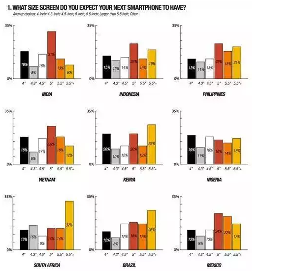 市場調(diào)研機(jī)構(gòu)對于用戶偏愛的手機(jī)尺寸,也進(jìn)行了調(diào)查。調(diào)查國家分別為印度、肯尼亞、南非、巴西、墨西哥等9個(gè)發(fā)展中國家。圖表顯示,其中5個(gè)國家的用戶更偏愛5英寸手機(jī),而南非、巴西、肯尼亞及尼日利亞的用戶,則更喜歡5.5英寸以上機(jī)型。
