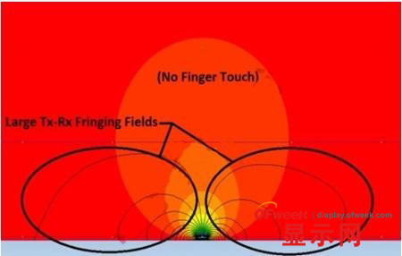 圖2顯示了未觸摸狀態(tài)下的磁力線示意圖。在沒有手指觸碰的情況下,Tx-Rx磁力線占據(jù)了蓋板內(nèi)相當(dāng)大的空間。邊緣磁力線投射到電極結(jié)構(gòu)之外,因此,術(shù)語“投射式電容”由之而來。